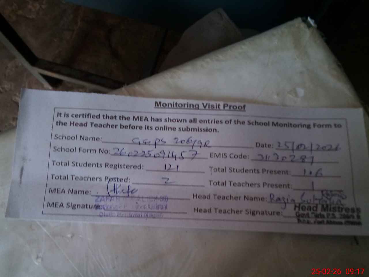 | Attendance Register | Head Teacher | MEA with School | Visit Proof |