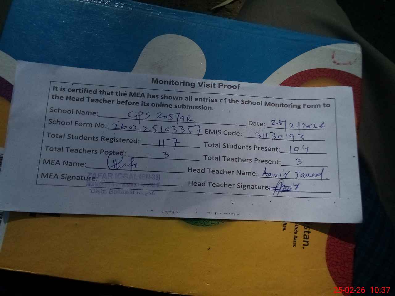 | EMIS Code: 31130193 | Name of School: GPS CHAK NO.205/9-R | |||