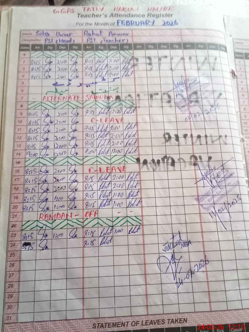 | CNIC | Full Name | Designation | R/C | Absence During Last Calender Month |