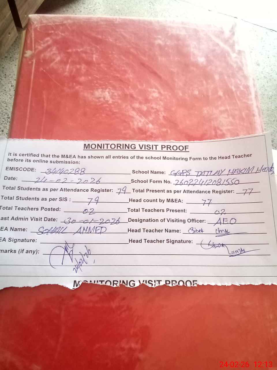 | Attendance Register | Head Teacher | MEA with School | Visit Proof |