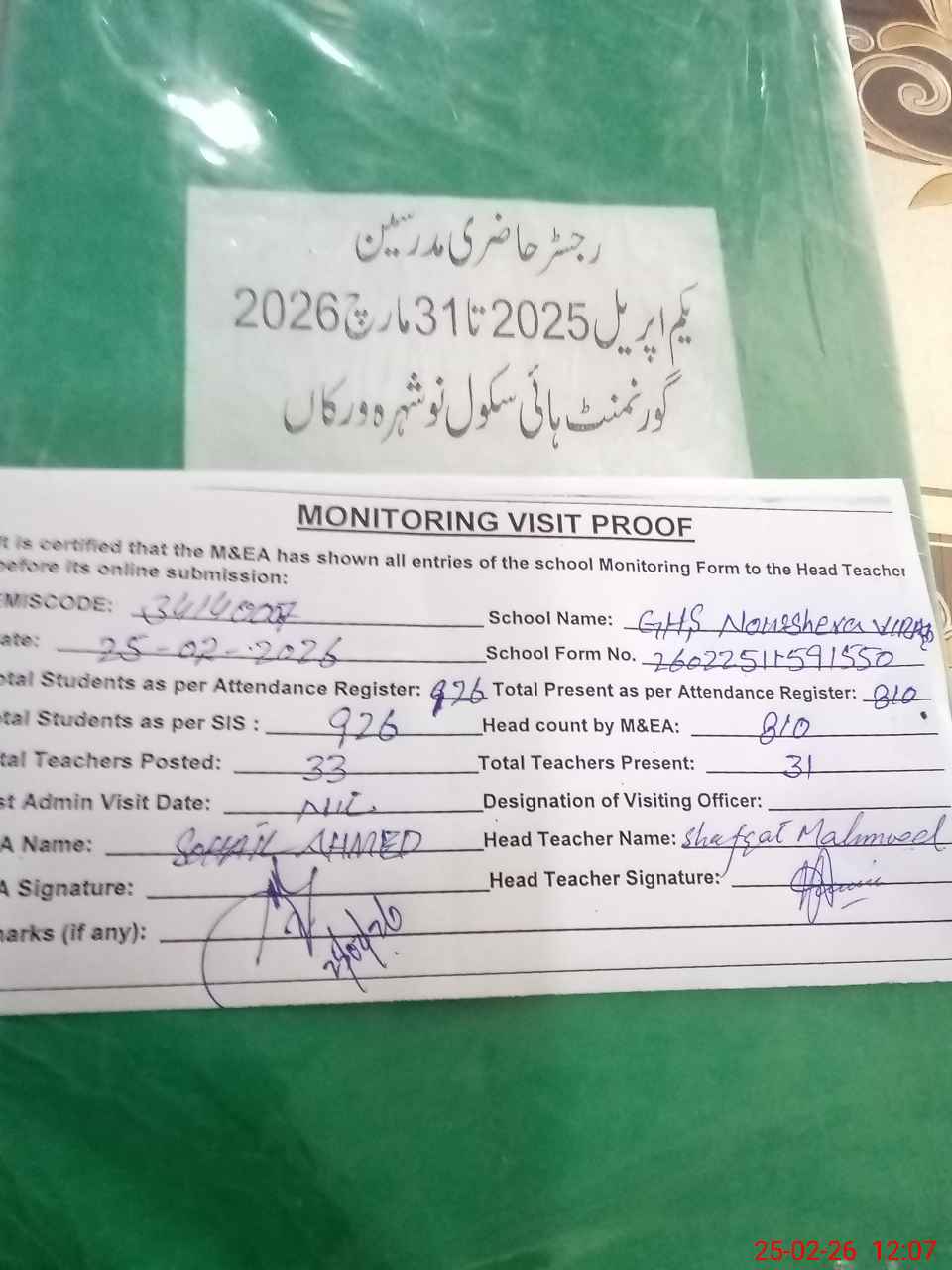 | Attendance Register | Head Teacher | MEA with School | Visit Proof |