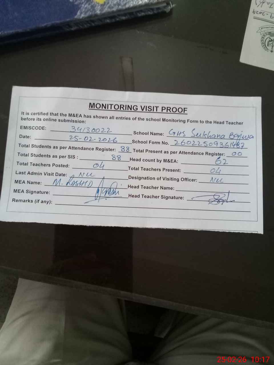 | Attendance Register | Head Teacher | MEA with School | Visit Proof |