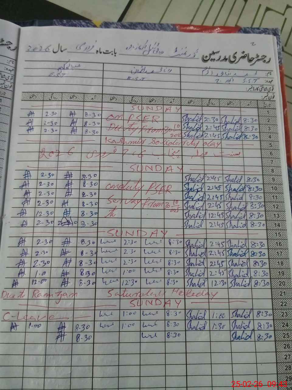 | CNIC | Full Name | Designation | R/C | Absence During Last Calender Month |