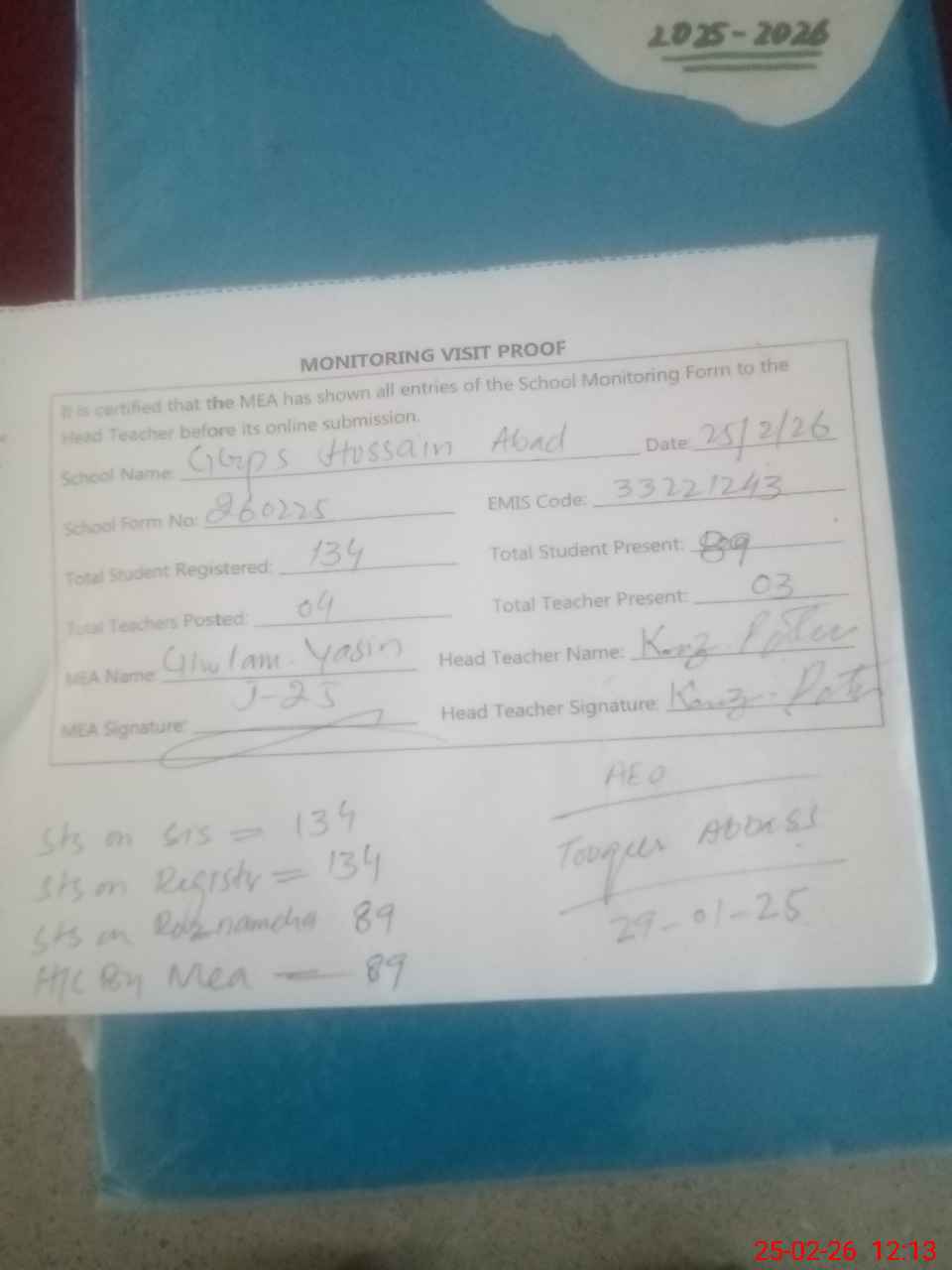 | EMIS Code: 33221243 | Name of School: GGPS HUSSAIN ABAD | |||