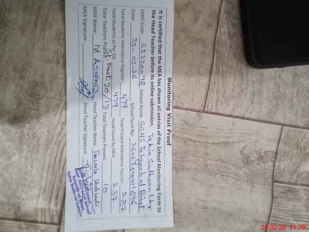 | Attendance Register | Head Teacher | MEA with School | Visit Proof |