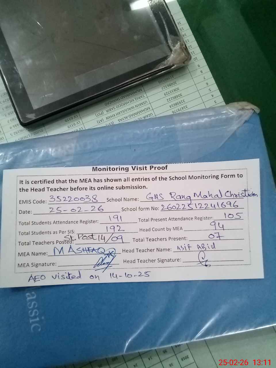| Remarks (Use Separate Page if Required): AEO Hafiz Muhammad Awais visited on 14-10-2025 Whole the school building is very old renovation, maintenance and paint work highly required School had 28 rooms while 10 classrooms are dangerous and not in use Total present students strength is 94 out of 191 while on Attendance Registers present strength is 105 here difference is 11 students 35220038 | |||||