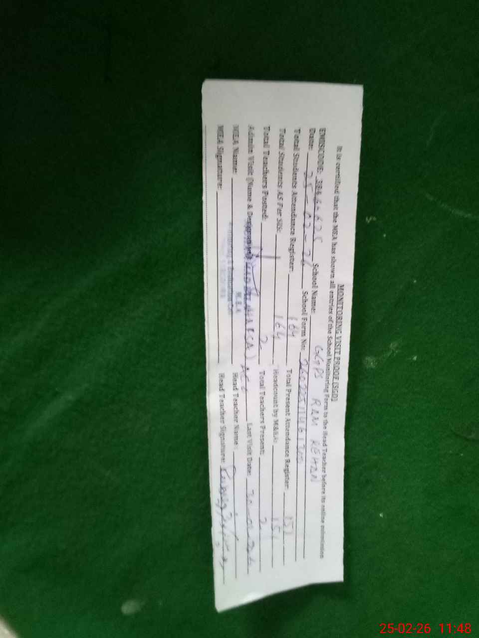 | Attendance Register | Head Teacher | MEA with School | Visit Proof |