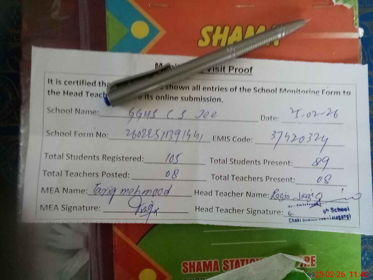 | Attendance Register | Head Teacher | MEA with School | Visit Proof |
