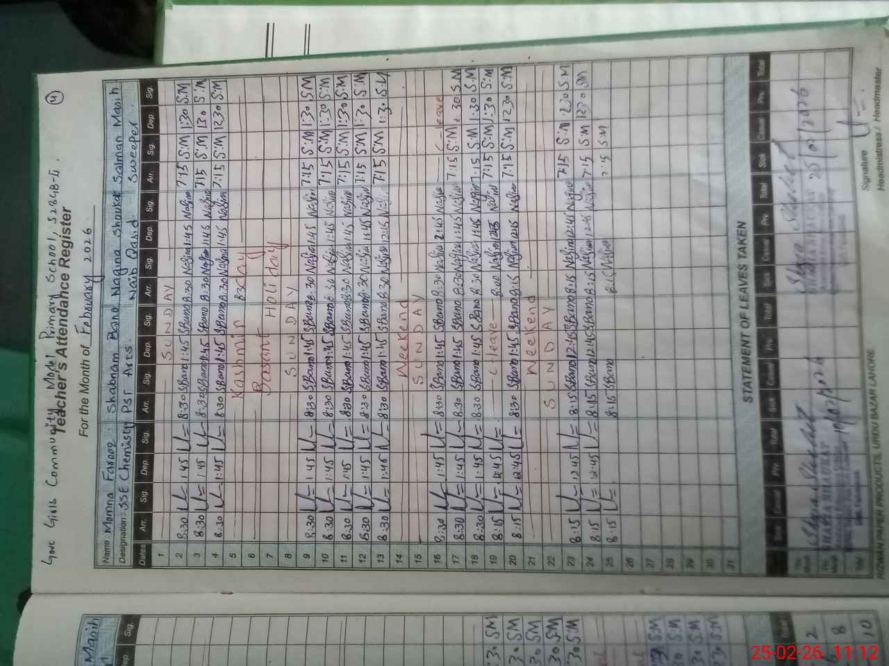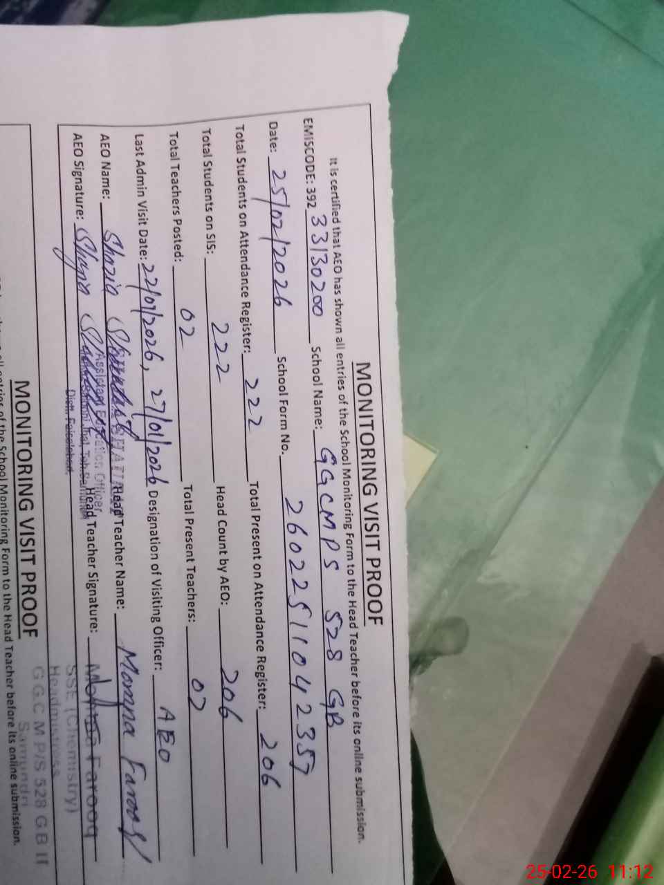 | Attendance Register | Head Teacher | MEA with School | Visit Proof |
