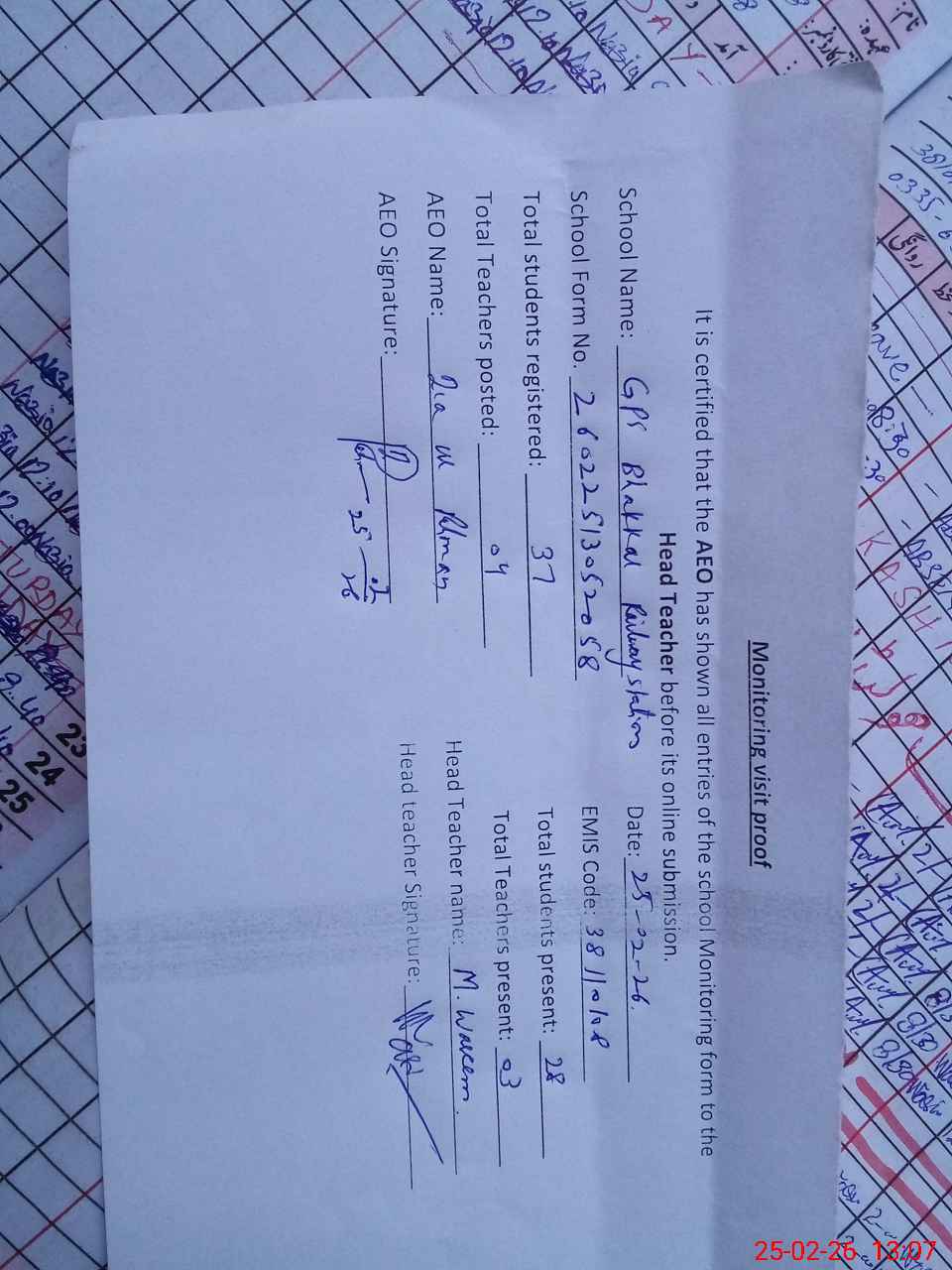| Attendance Register | Head Teacher | MEA with School | Visit Proof |