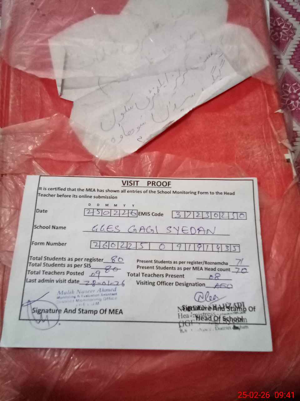 | Attendance Register | Head Teacher | MEA with School | Visit Proof |