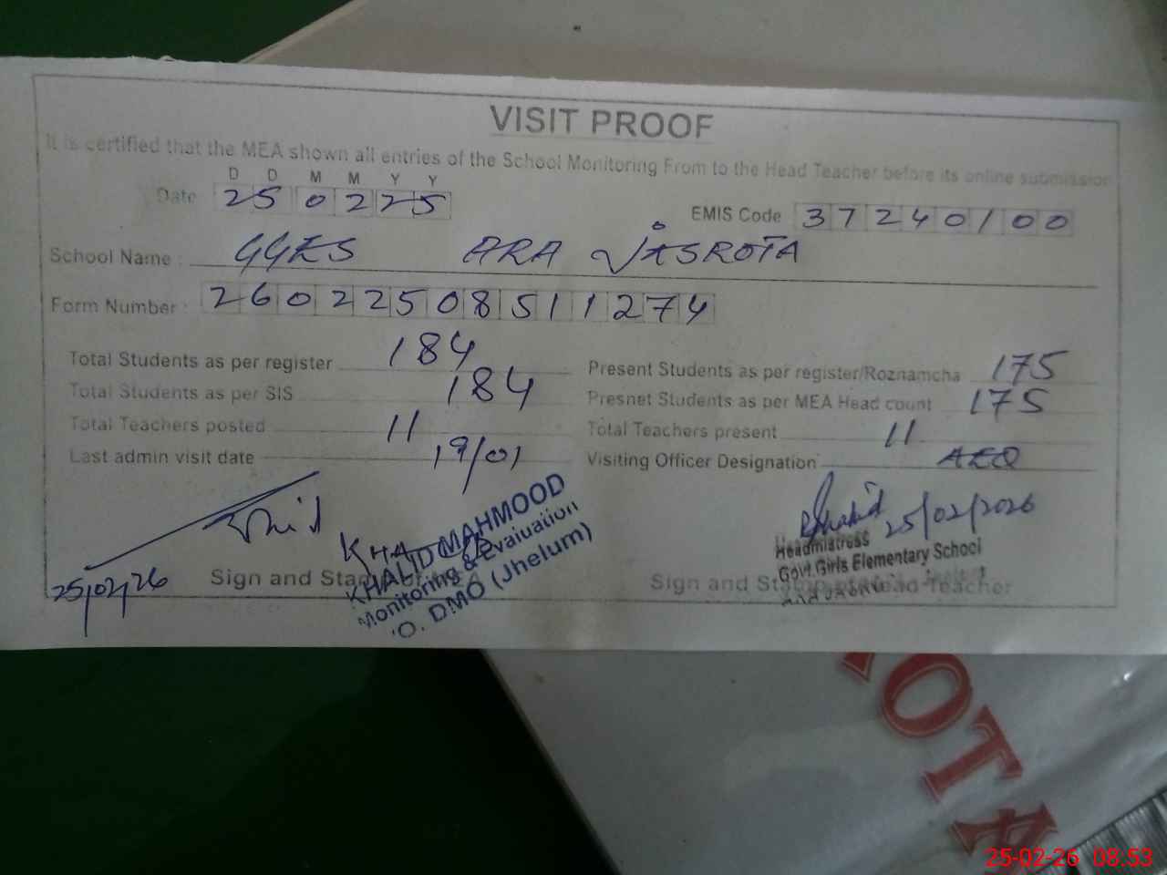 | Attendance Register | Head Teacher | MEA with School | Visit Proof |