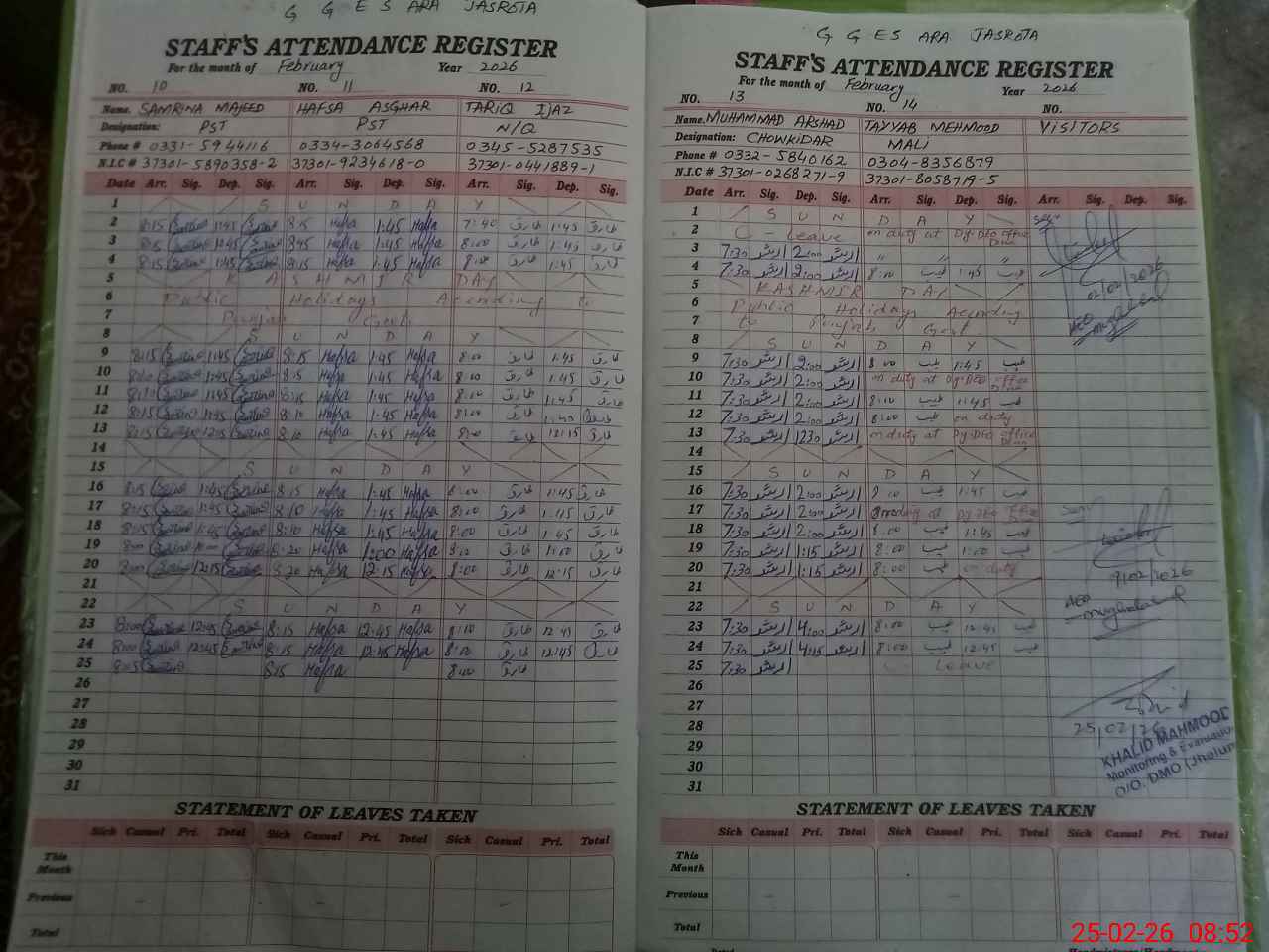 | CNIC | Full Name | Designation | R/C | Absence during last cal. month |