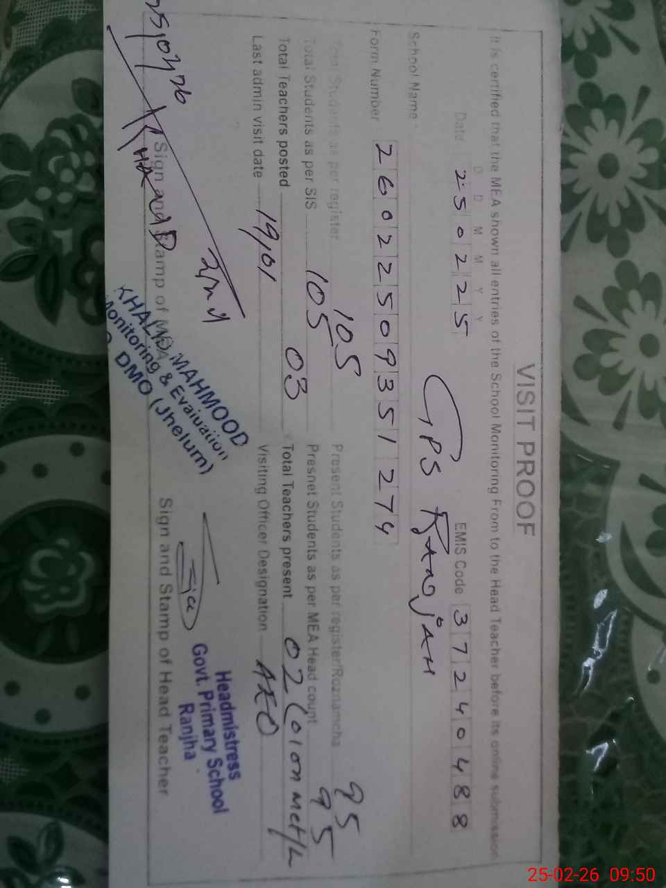 | EMIS Code: 37240488 | Name of School: GPS RANJHA | |||
