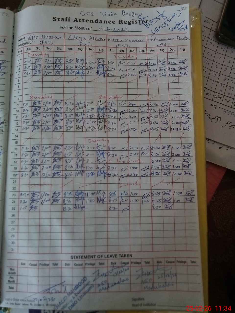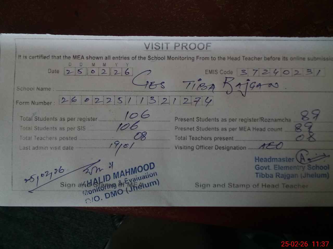 | Attendance Register | Head Teacher | MEA with School | Visit Proof |