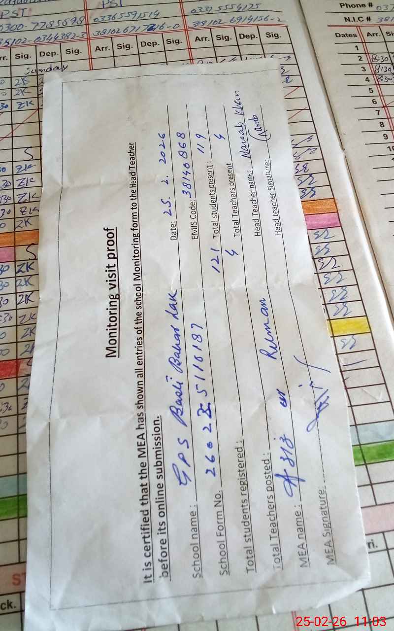 | Attendance Register | Head Teacher | MEA with School | Visit Proof |