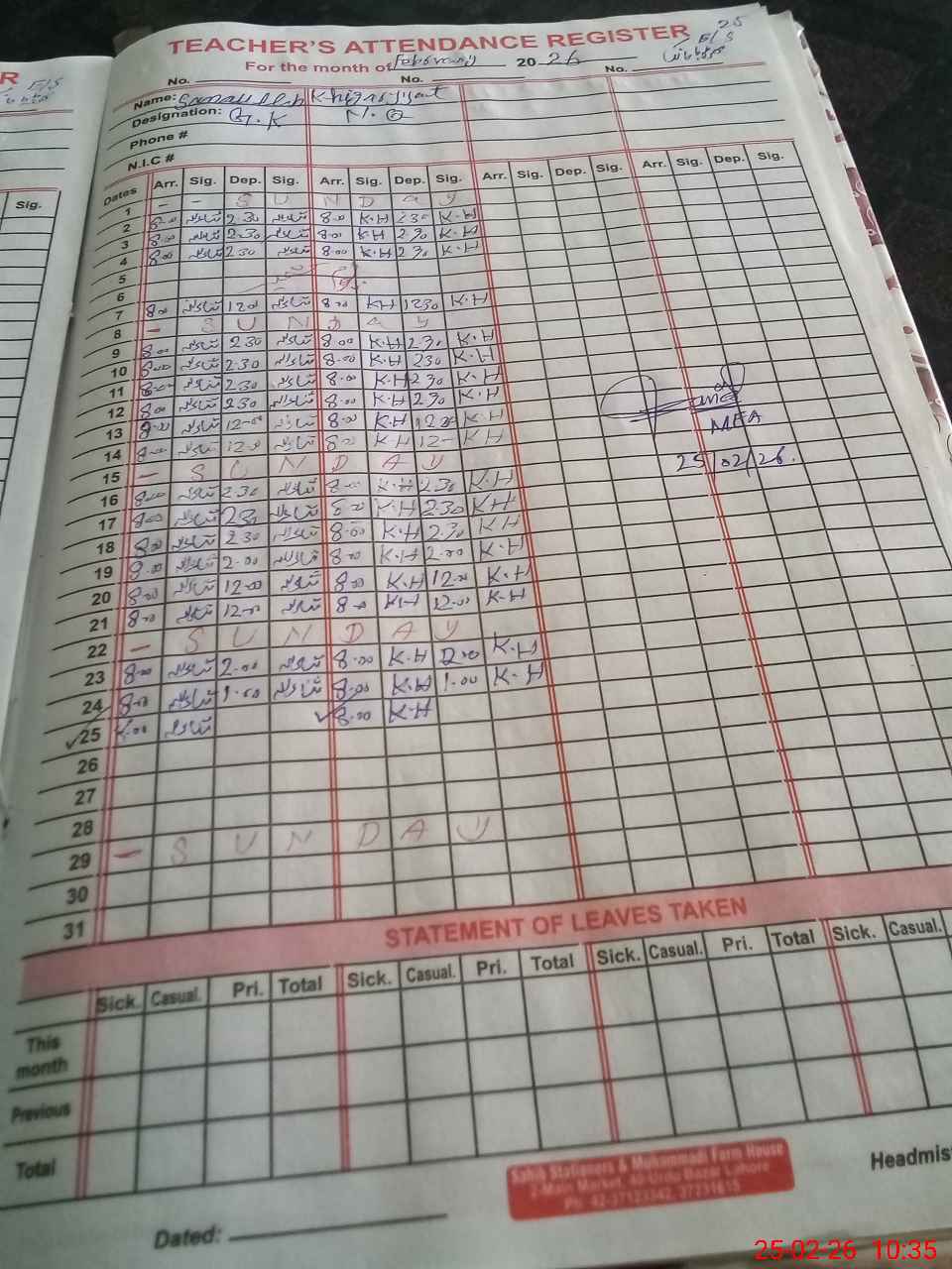 | Name: Na**** Su**** Designation: (School Headmaster's/Headmistress's) PSSP Phone/Cell Number: 03**** |