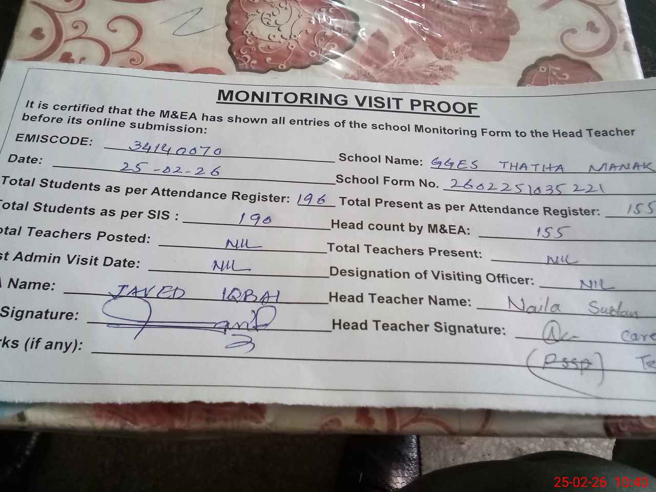 | Certified that this School was Inspected by the Undersigned MEA/DMO Today and the Information Stated Above is as Per Record. | |||||