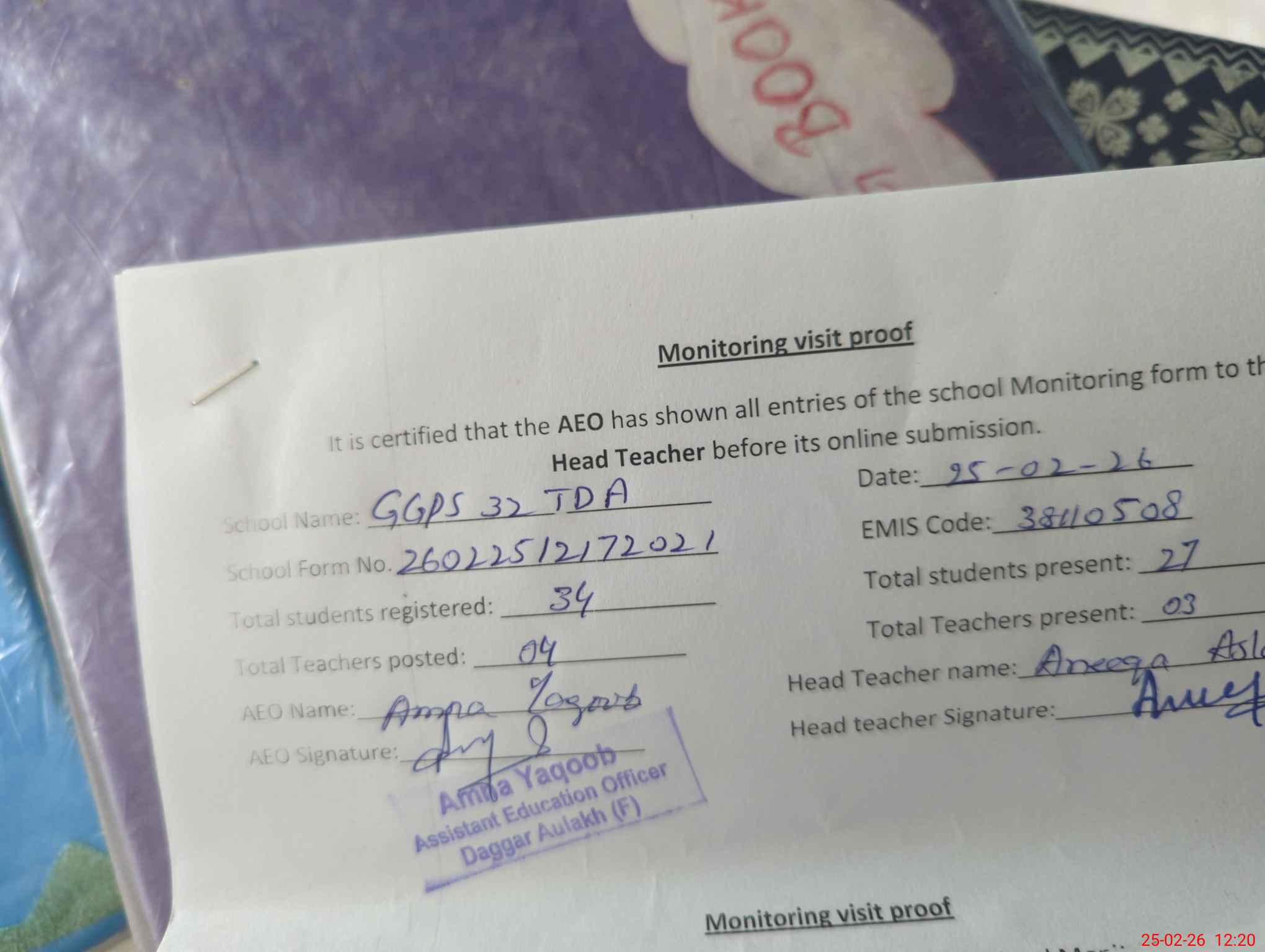 | Attendance Register | Head Teacher | MEA with School | Visit Proof |
