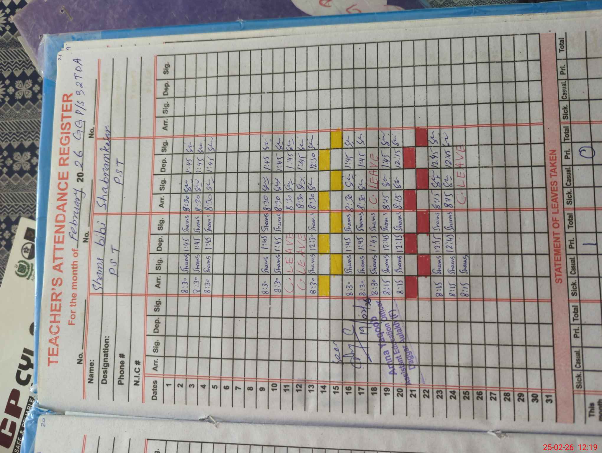 | Name: An**** As**** Designation: (School Headmaster's/Headmistress's) PST Phone/Cell Number: 03**** |