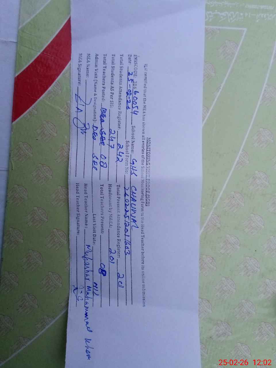 | Attendance Register | Head Teacher | MEA with School | Visit Proof |