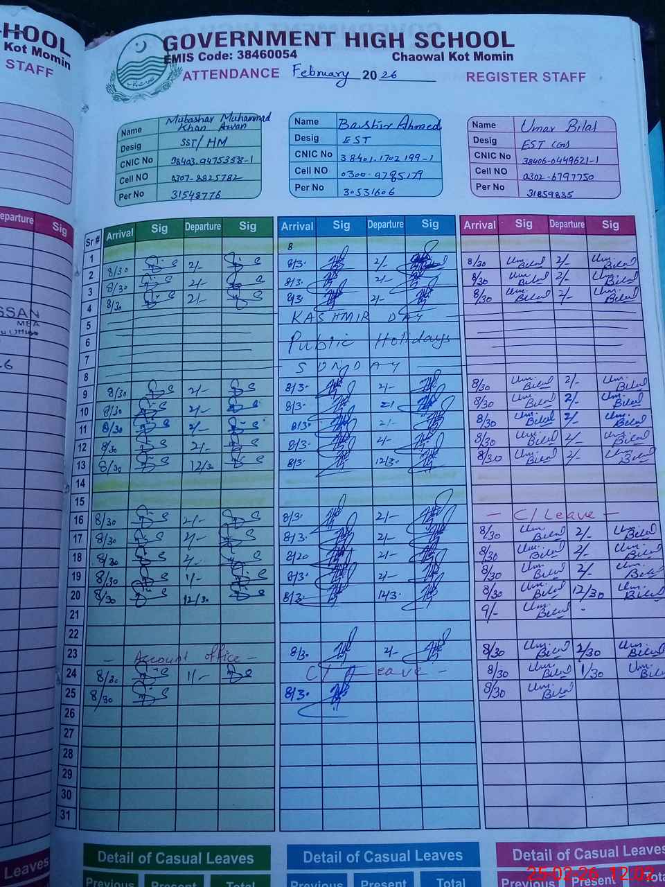 | CNIC | Full Name | Designation | R/C | Absence during last cal. month |