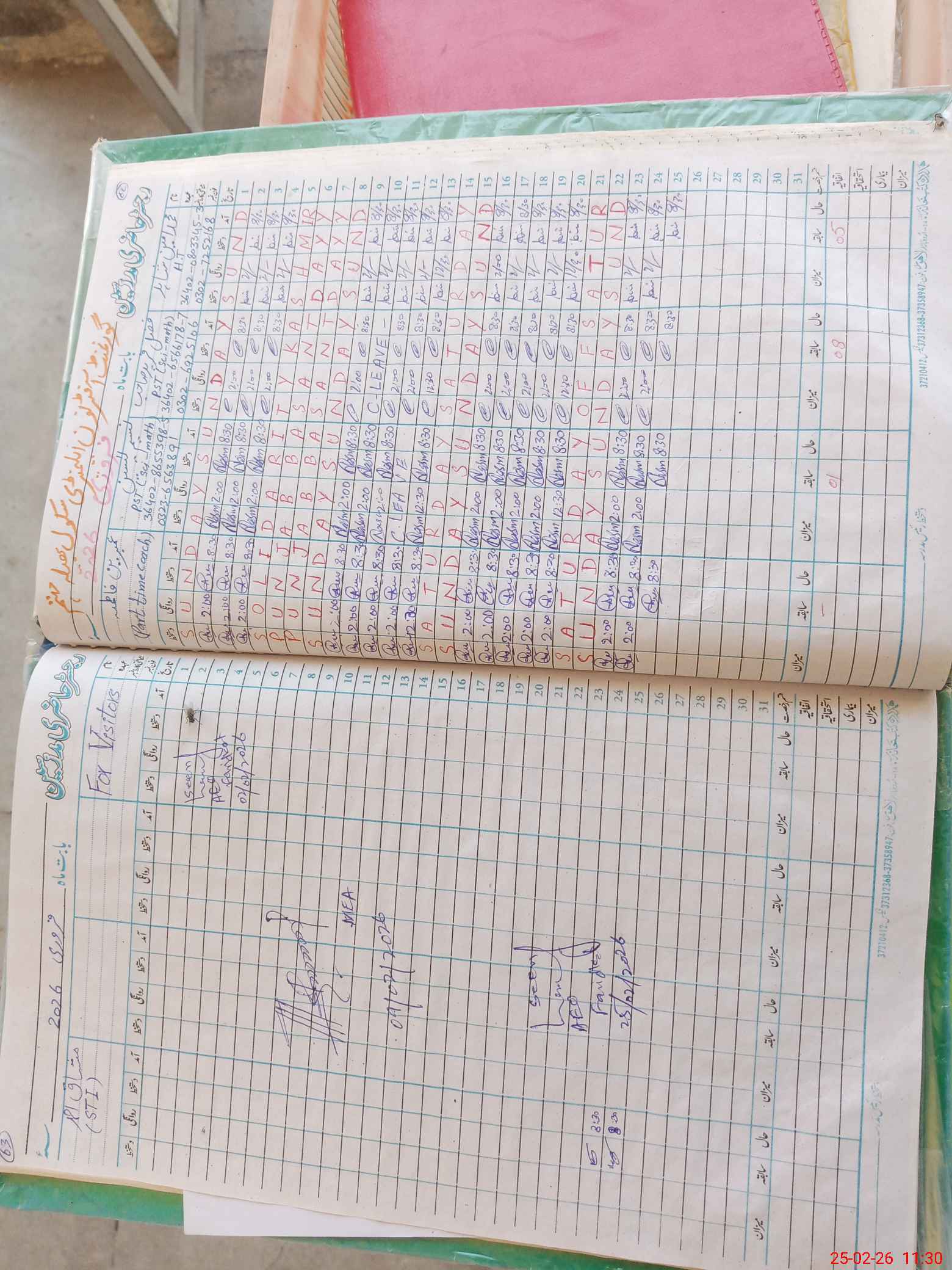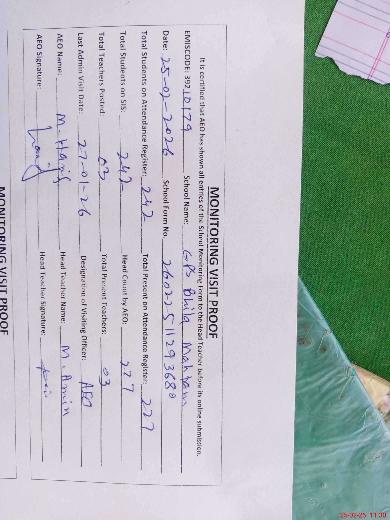 | Attendance Register | Head Teacher | MEA with School | Visit Proof |