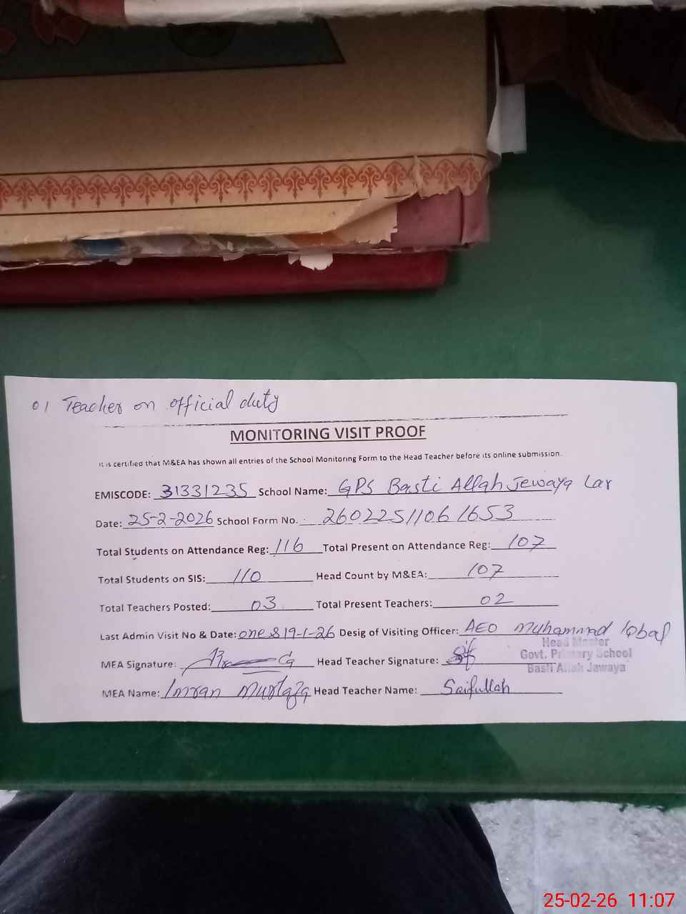 | Attendance Register | Head Teacher | MEA with School | Visit Proof |