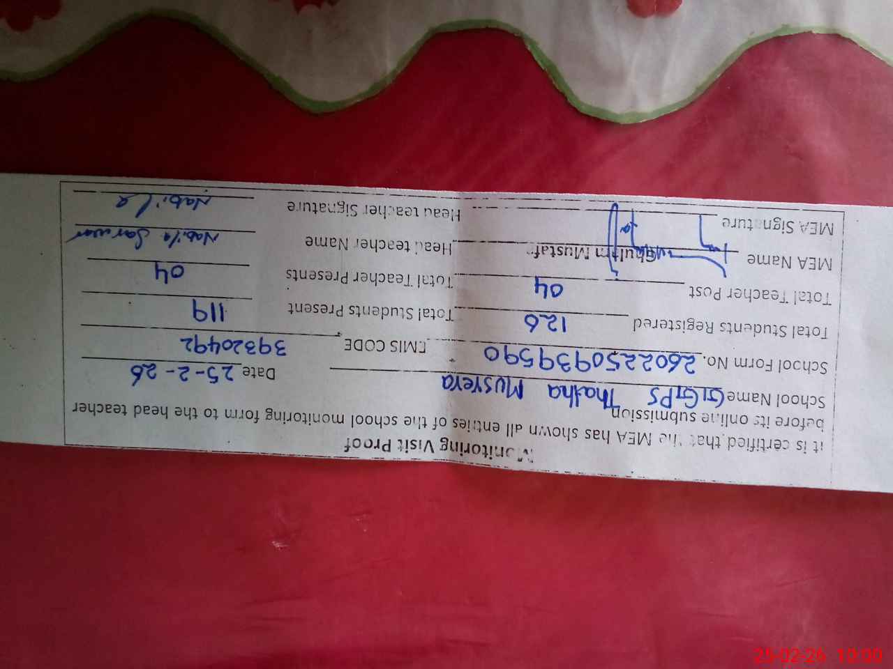 | Attendance Register | Head Teacher | MEA with School | Visit Proof |