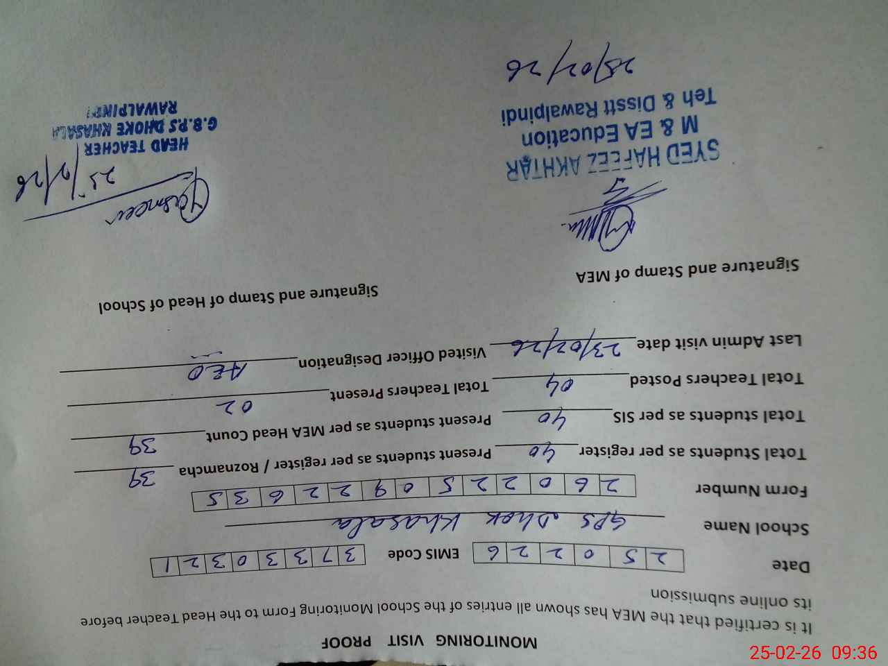 | Certified that this School was Inspected by the Undersigned MEA/DMO Today and the Information Stated Above is as Per Record. | |||||