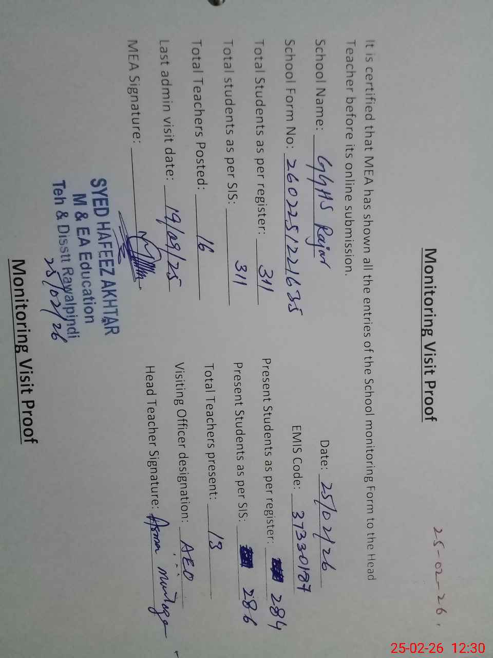 | Certified that this School was Inspected by the Undersigned MEA/DMO Today and the Information Stated Above is as Per Record. | |||||