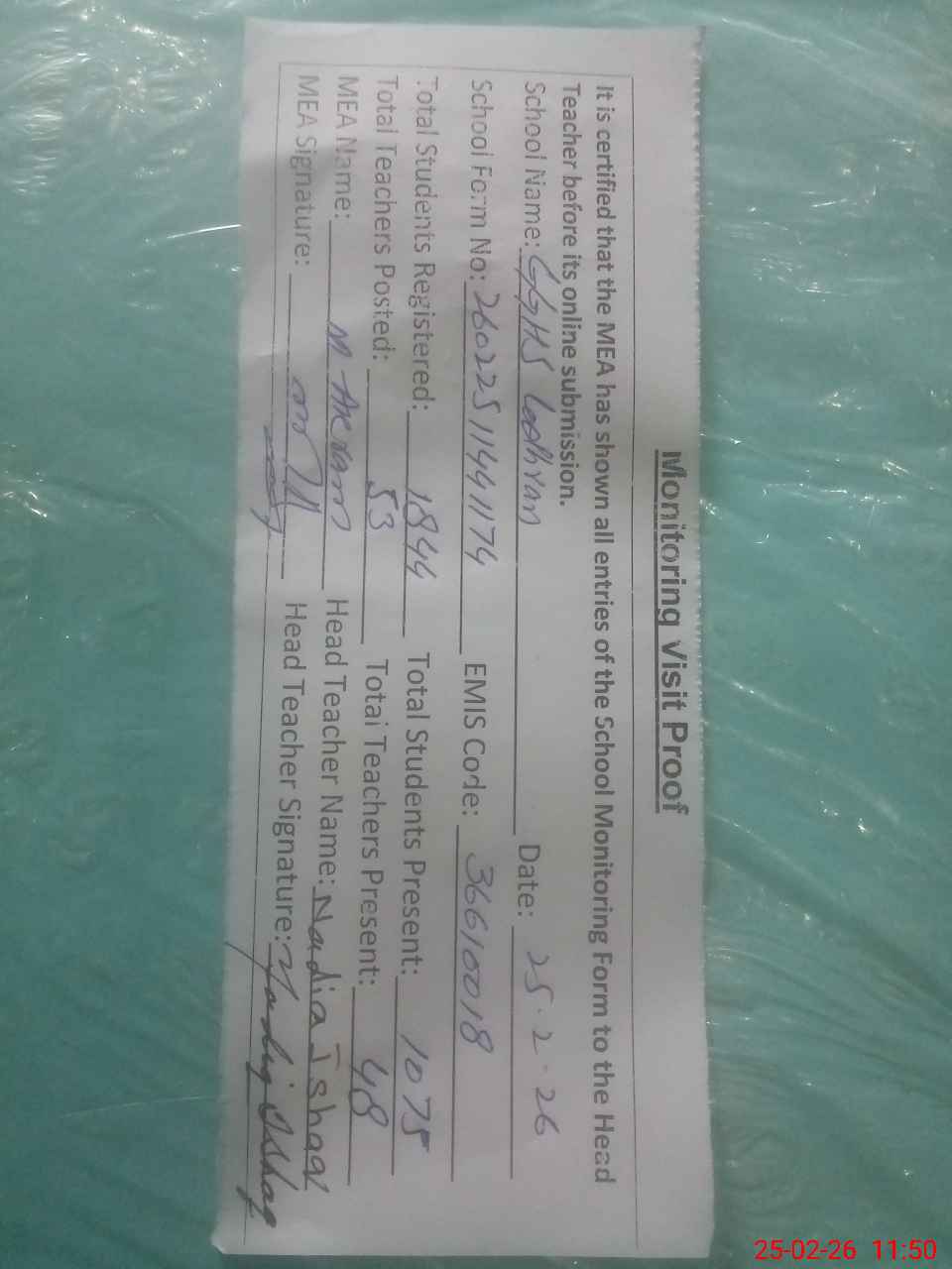 | Attendance Register | Head Teacher | MEA with School | Visit Proof |