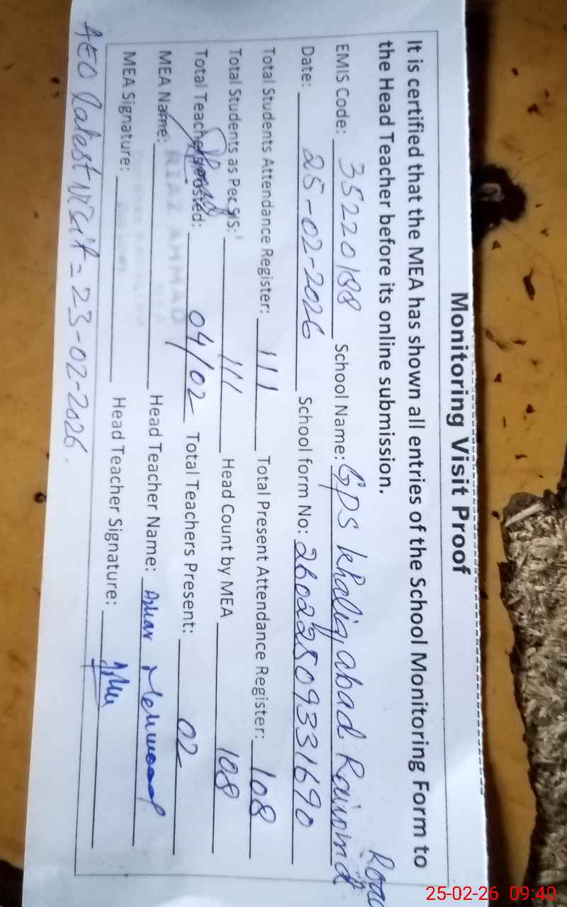 | Attendance Register | Head Teacher | MEA with School | Visit Proof |