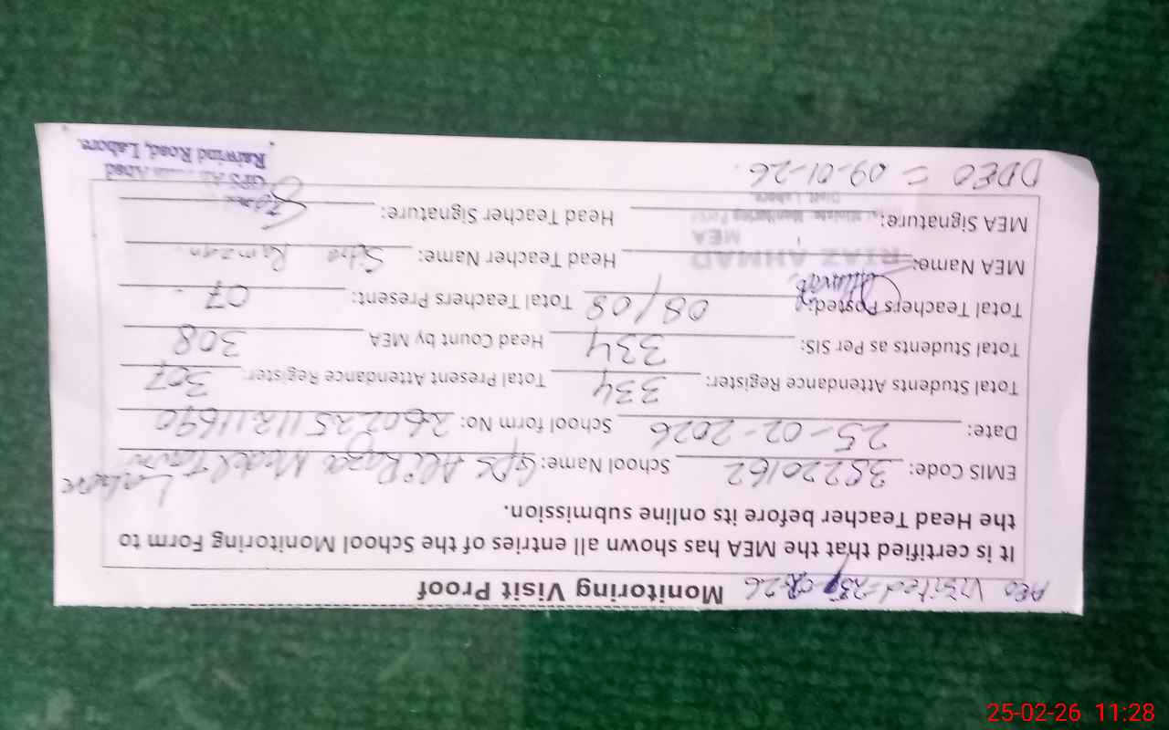| Attendance Register | Head Teacher | MEA with School | Visit Proof |