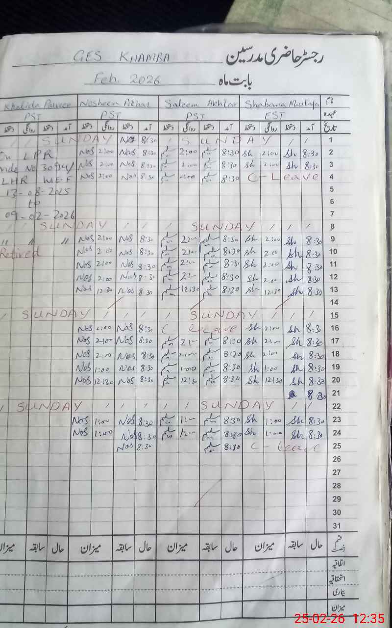 | CNIC | Full Name | Designation | R/C | Absence During Last Calender Month |