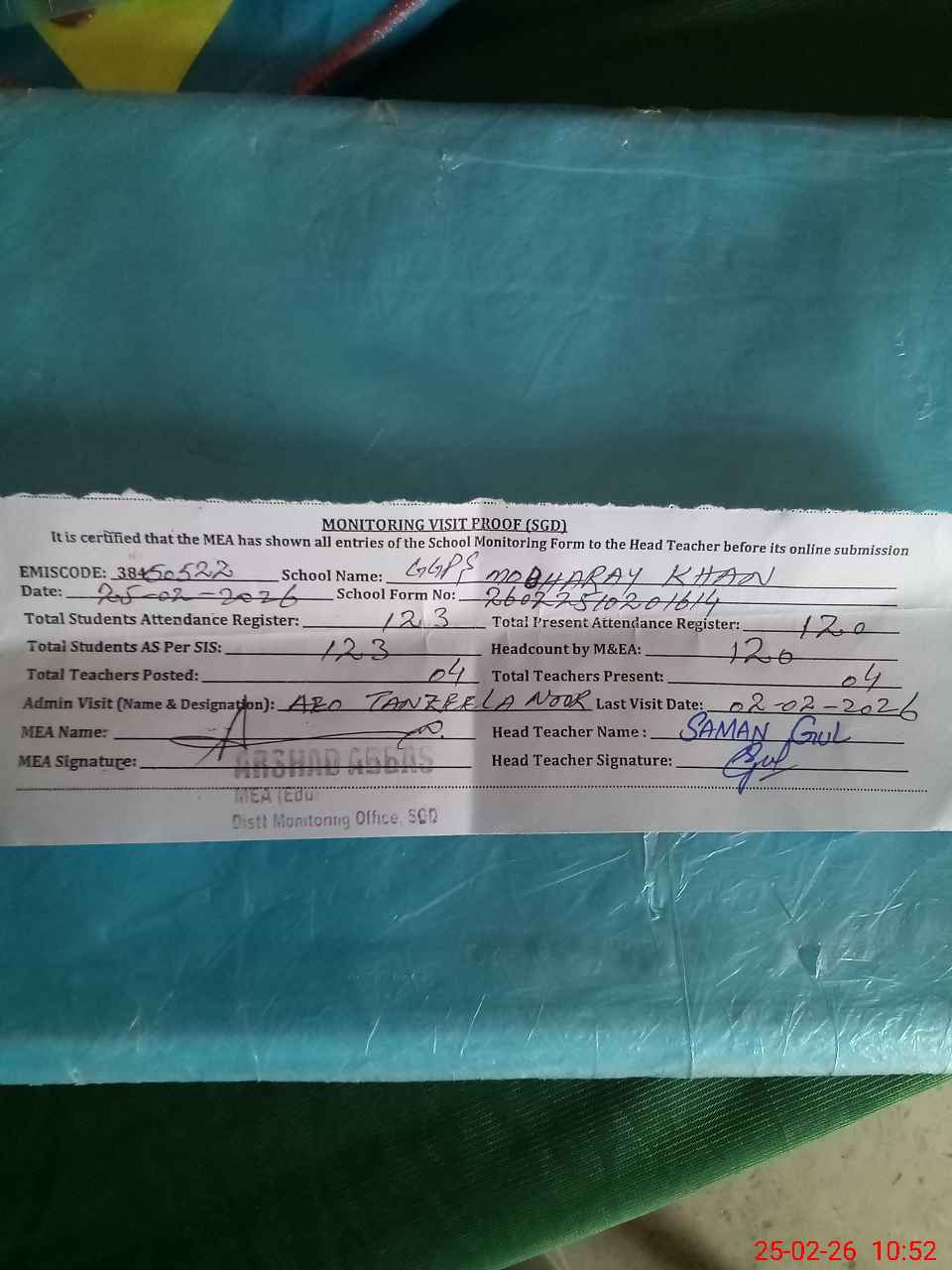 | EMIS Code: 38450522 | Name of School: GGPS MOBHARAY KHAN | |||