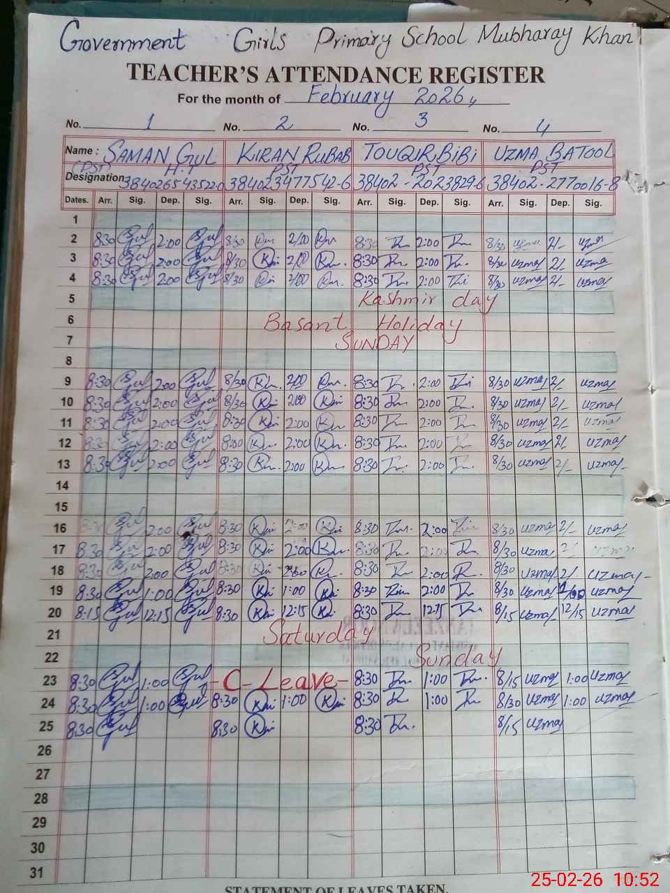 | CNIC | Full Name | Designation | R/C | Absence During Last Calender Month |
