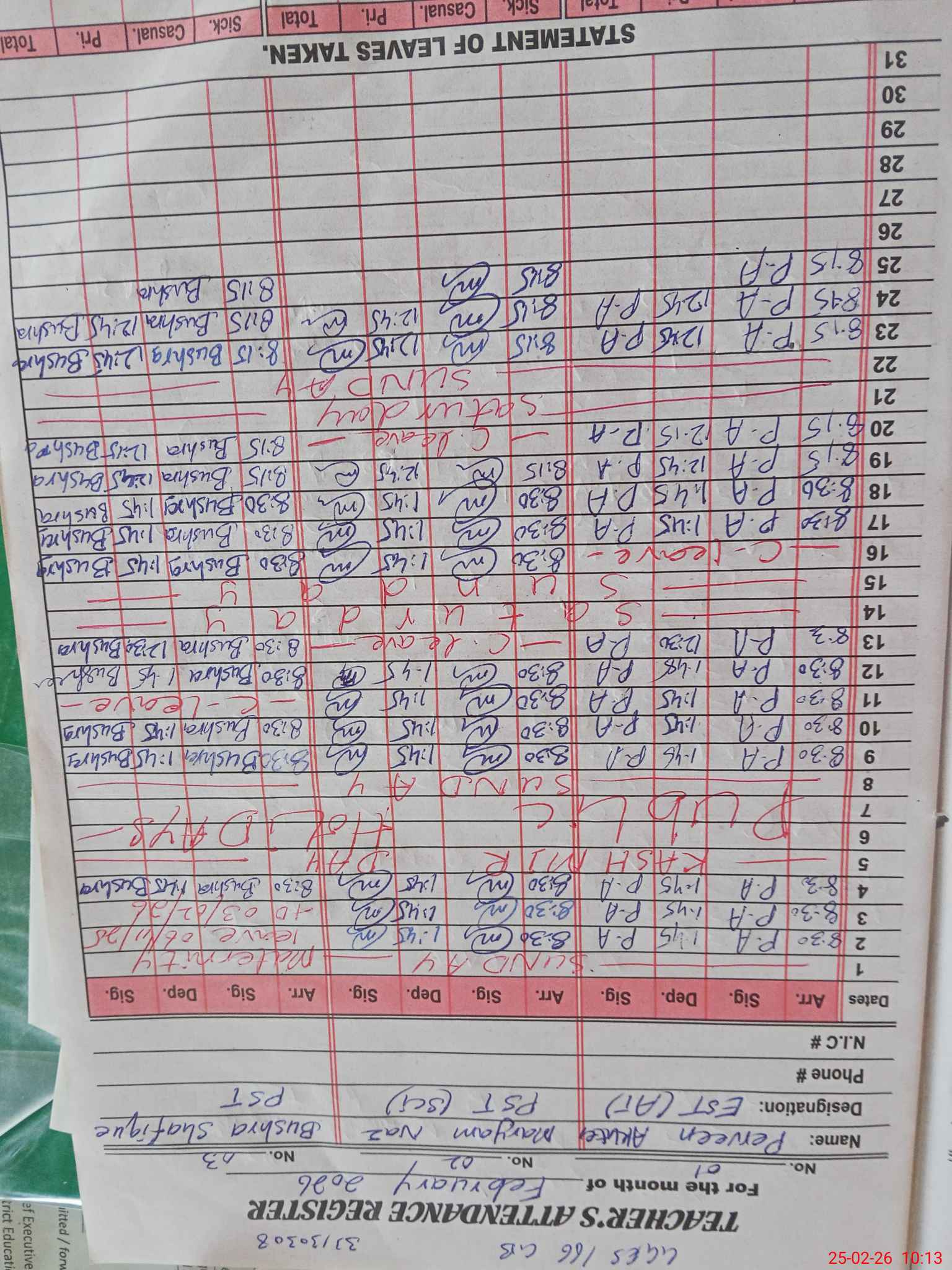 | CNIC | Full Name | Designation | R/C | Absence During Last Calender Month |