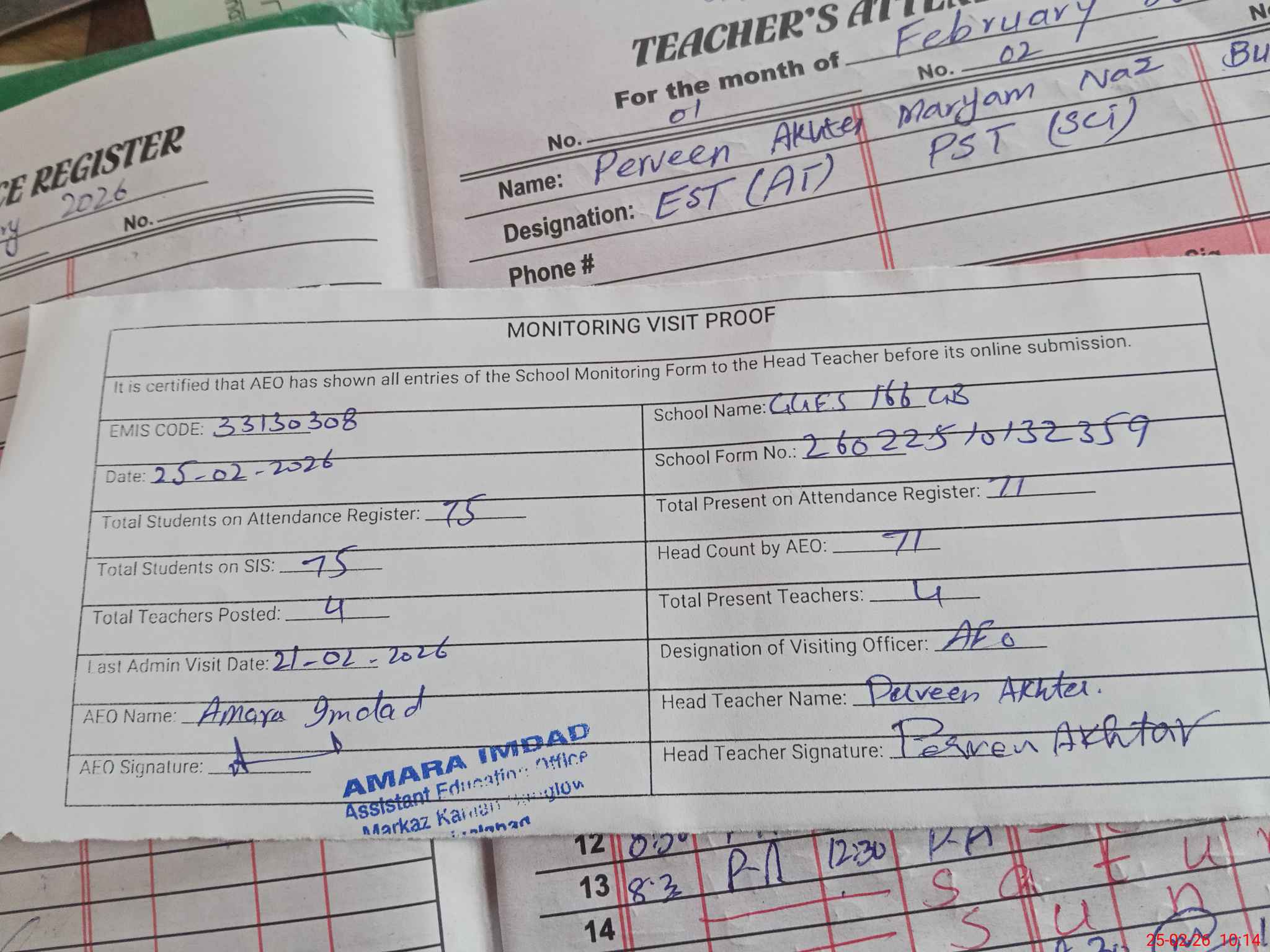 | Attendance Register | Head Teacher | MEA with School | Visit Proof |