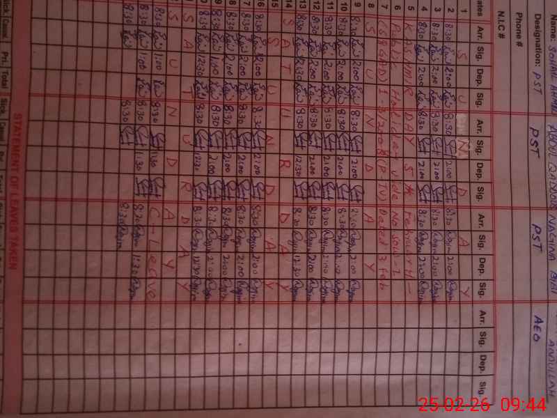 | CNIC | Full Name | Designation | R/C | Absence During Last Calender Month |