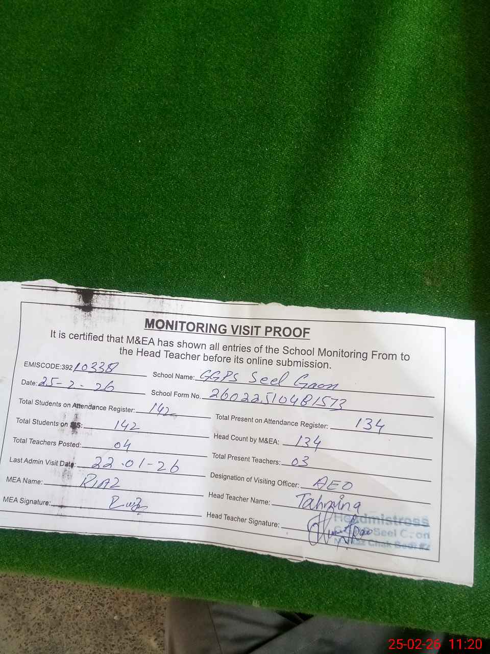 | Attendance Register | Head Teacher | MEA with School | Visit Proof |