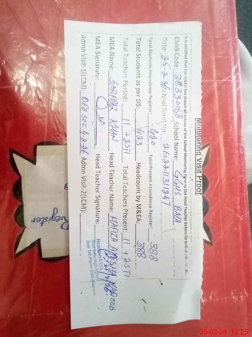 | Attendance Register | Head Teacher | MEA with School | Visit Proof |