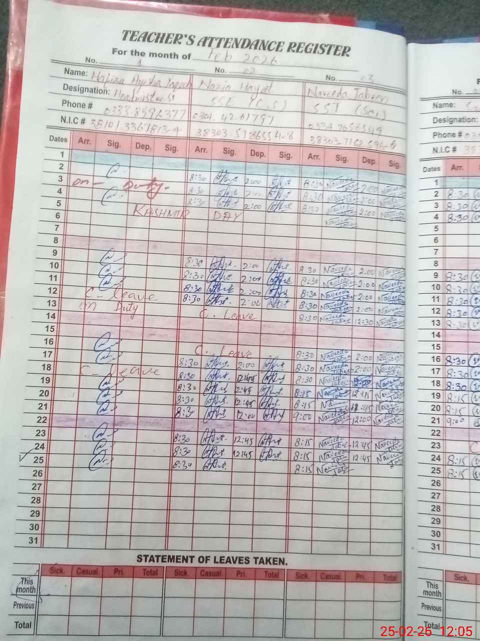 | CNIC | Full Name | Designation | R/C | Absence during last cal. month |