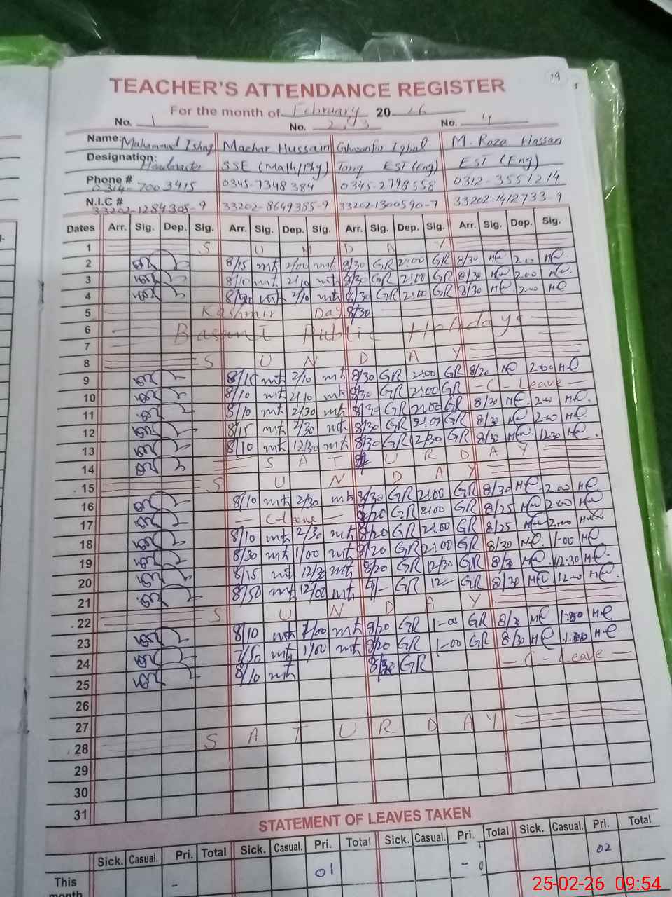 | CNIC | Full Name | Designation | R/C | Absence during last cal. month |
