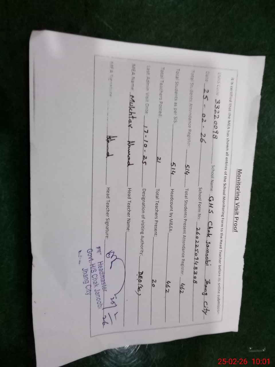 | Attendance Register | Head Teacher | MEA with School | Visit Proof |