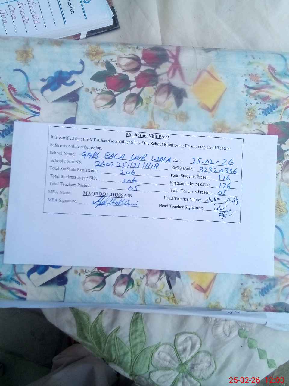 | Attendance Register | Head Teacher | MEA with School | Visit Proof |