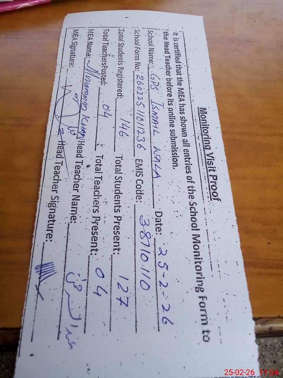 | Attendance Register | Head Teacher | MEA with School | Visit Proof |
