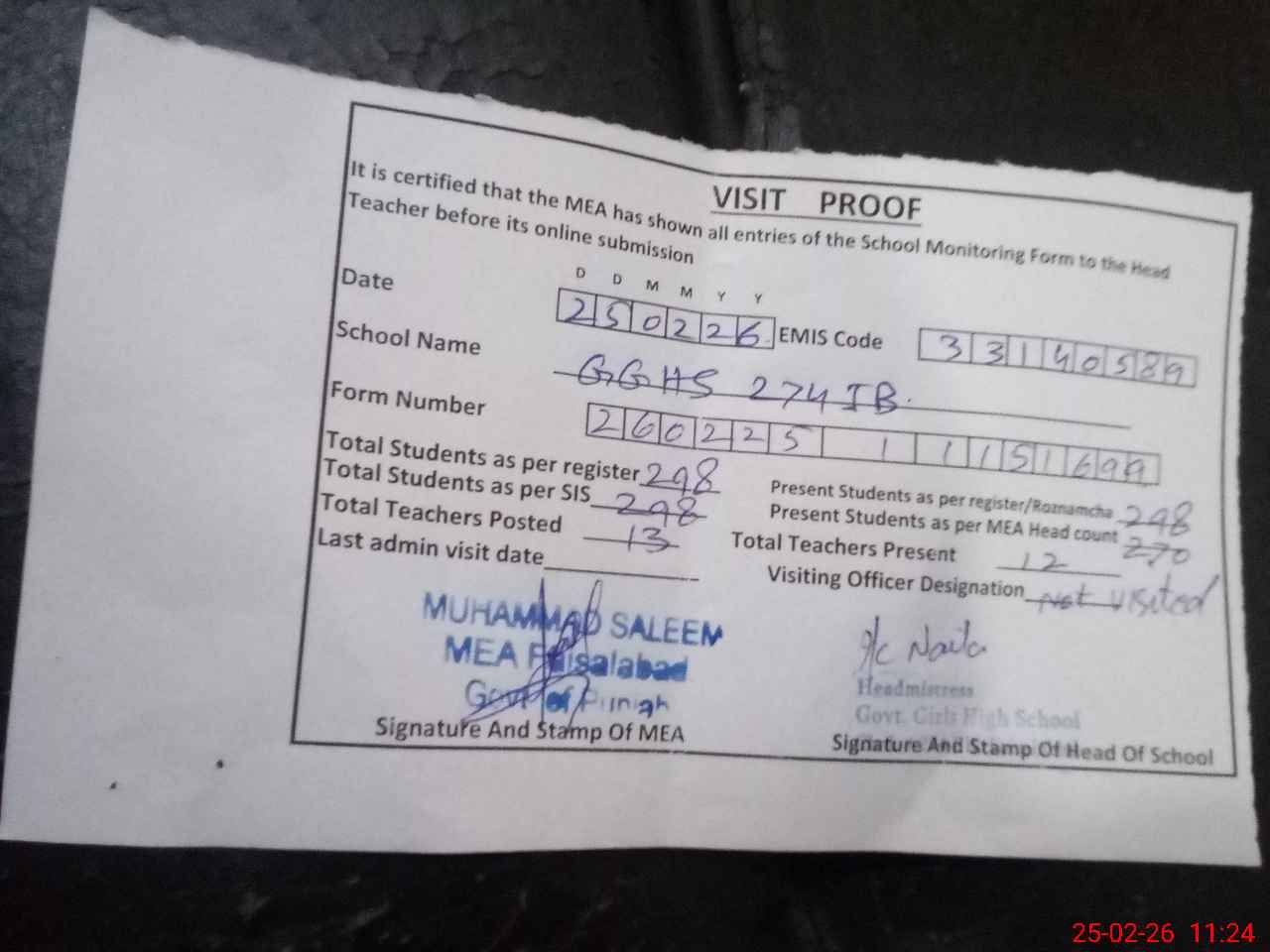 | Attendance Register | Head Teacher | MEA with School | Visit Proof |