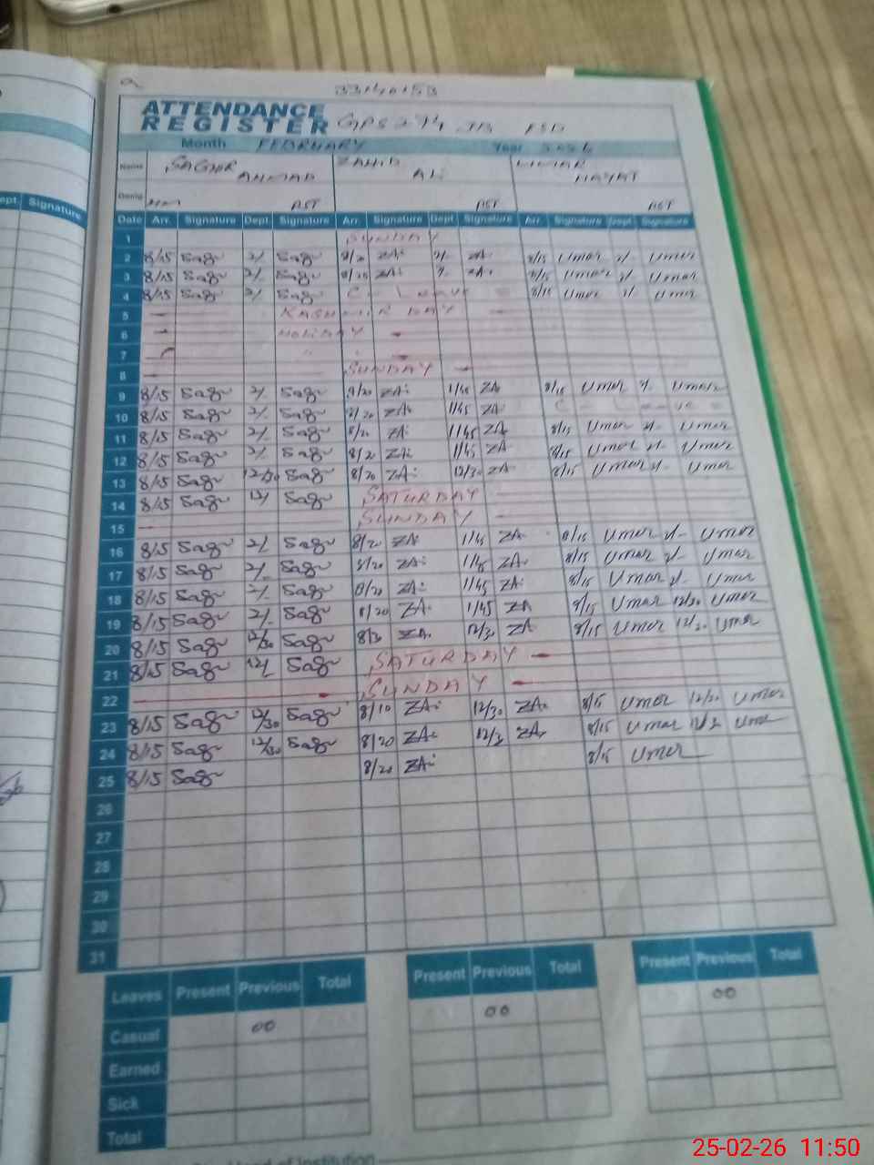 | CNIC | Full Name | Designation | R/C | Absence During Last Calender Month |