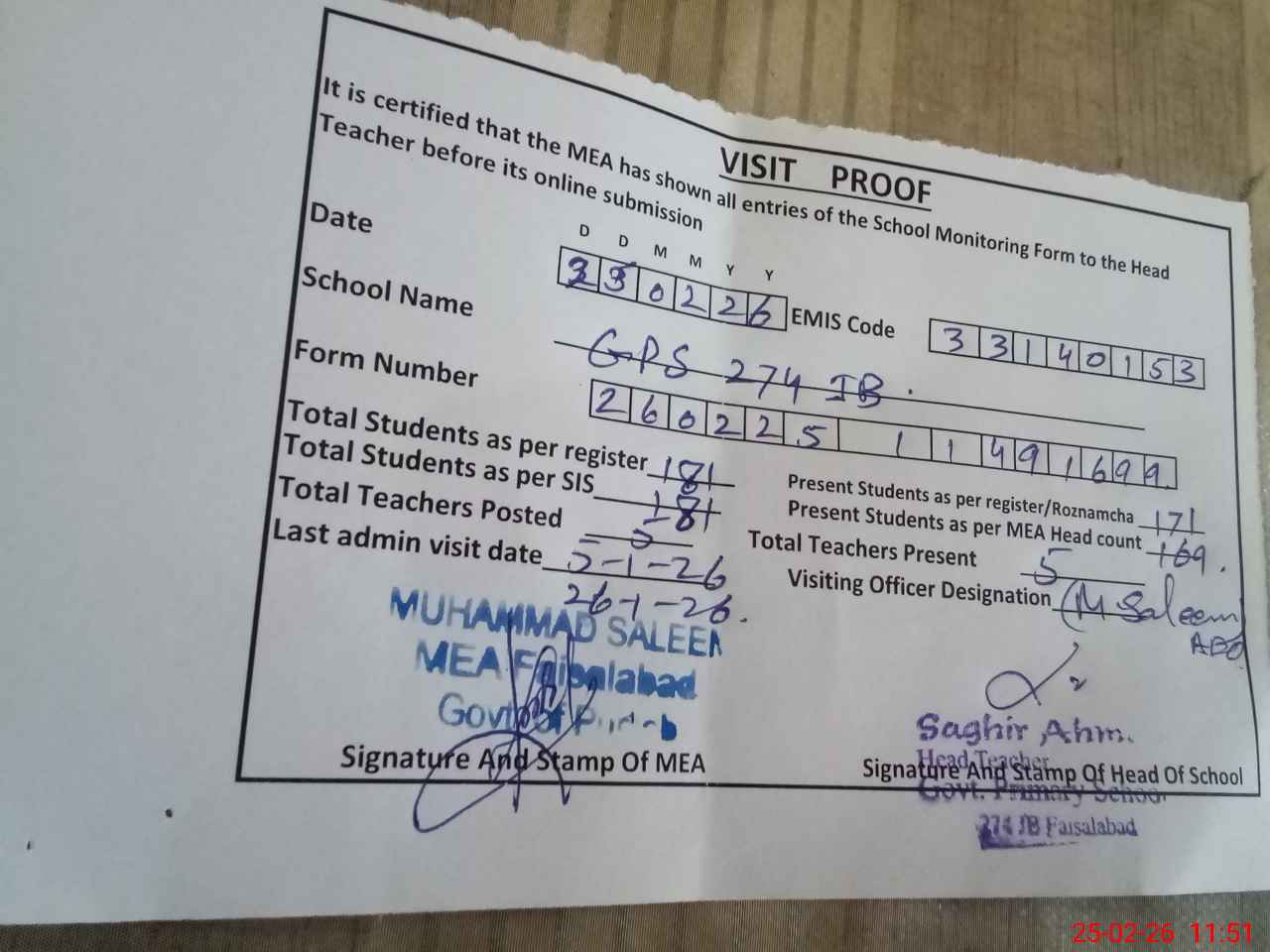 | Attendance Register | Head Teacher | MEA with School | Visit Proof |